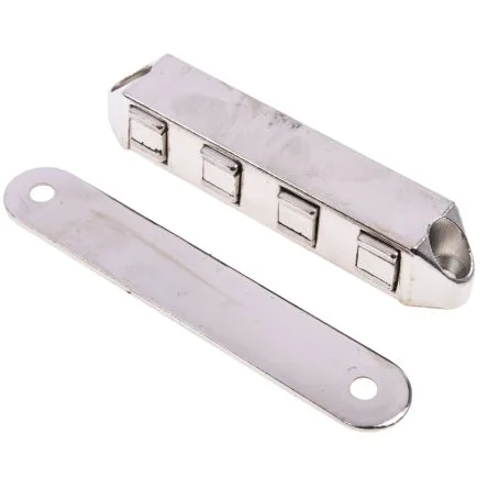 RS PRO Super Polar Magnetic Catch. RS PRO rectangular shape screw-on magnetic catches with counter plate and features an 8 kg force and has a high temperature resistance. Magnetic catches are a simple and effective way to hold cupboard doors in cabinets and enclosures closed. The catch consists of a magnet or series of magnets within a casing which is fixed to the cabinet door. When the door is closed, in the case of metallic cabinet, it is held closed by the magnet. If the cabinet is non-metallic a magnetically receptive counter plate can be fitted to the unit. When the door closes the magnetic catch and the counter plate meet and are held together magnetically securing the door. RS PRO have a great range of magnetic catches with different fixing methods and holding forces for all your fastening needs. Features and Benefits:. Polar magnetic catch supplied complete with counter plate Screw fixing method - catch requires 3.5mm screws Max operating temperature 80°C Zinc alloy construction - zinc die-cast with nickel plated finish Swinging opening Holding force 8kg. Typical Applications. Magnetic catches eliminate the need to install latch hardware on the door making them ideal for use in lightweight sheet metal doors and enclosures. Magnetic catches are a very easy and effective way of keeping doors held in placed once they are closed. These catches have a metal plate and a magnetic catch which together makes a fastening for all types of doors. Applications include electronic and industrial enclosures, automotive applications, exhibits and signs and vending machines.