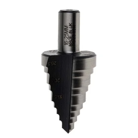 RS PRO High-Speed Steel (HSS) Step Drill Bits. RS PRO range of HSS step drill bits offers advantages over conventional drilling and cutting methods and can be used for many different industrial applications. The cone shape unique design of the RS PRO step drill bits allows various popular hole sizes to be drilled with just one tool. HSS Step Drill Bit Options:- ; 123-8508 123-8508 - 10 Steps, 6 to 30.5 mm step drill bit 10 mm shank ; 123-8509 123-8509 - 12 Steps, 6 to 30 mm step drill bit 10 mm shank ; 123-8510 123-8510 - 9 Steps, 4 to 12 mm step drill bit 6.5 mm shank ; 123-8511 123-8511 - 13 Steps, 5 to 35 mm step drill bit 13 mm shank ; 123-8512 123-8512 - 16 to 32 mm conduit entry step drill ; 123-8513 123-8513 - 10 Steps, 4 to 22 mm step drill 10 mm shank ; 123-8514 123-8514 - 16 to 25 mm conduit entry step drill ; 123-8515 123-8515 - 12 to 25 mm Clearance ; Tapping step drill. Features and Benefits:. ;ul> ;li>High quality drill bit and easy to enlarge holes ;/li> ;li>One tool that can drill various sizes ;/li> ;li>Reduced vibration ;/li> ;li>Faster drilling rate ;/li> ;li>Available in sizes ;/li> ;/ul>. Application Information. Step drill bits are typically used in electrical, plumbing and HVAC applications. They are used for drilling multiple sized holes without the need to frequently change bit sizes. They are compatible with corded or cordless power tools. RS PRO HSS step drill bits are the ideal choice for all your drilling in industrial applications. FAQs. Why would you buy a step drill? A step drill is a single piece accessory with optimised flute angles. It offers a unique tip design that eliminates movement and increases drilling speed. They are compatible with any power tool that incorporates a chuck, for example; cordless drill drivers What material will it drill through? Typical materials include: Stainless steel Aluminium Soft metals Plastics How good step drill bits? A step drill bit is an accessory that gets overlooked, the working principle is so simple you can drill multiple size holes without changing the bit and achieve a nice clean finish every time. Can a step drill bit be used with a stationary drill machine? Yes, step drill bits are compatible with portable hand power tools as well a stationary drilling machines.