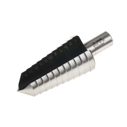 RS PRO High-Speed Steel (HSS) Step Drill Bit. RS PRO range of HSS step drill bits. These high-speed steel multi-diameter cutters require no pilot hole and are ideal for the rapid drilling of sheet metals and plastics. Their stepped cone shape allows for multiple diameter cutting surfaces on one drill. These drill bits can be used with power drills with a 13 mm chuck. Step Drill Bit Options:- ; 232-557 232-557 - 4 to 20 mm Drill Bit, 9 Steps ; 232-563 232-563 - 4 to 30 mm Drill Bit, 14 Steps ; 232-579 232-579 - 10 to 20 mm Drill Bit, 11 Steps ; 232-585 232-585 - 20 to 30 mm Drill Bit, 11 Steps ; 232-608 232-608 - 3 piece Drill Set 4 mm to 30 mm. Features and Benefits:. ;ul> ;li>HSS drill bits ;/li> ;li>Provides clear holes in applications requiring small hole size increments ;/li> ;li>No pilot hole required easily enlarges existing holes ;/li> ;li>Ideal for use with most power drills ;/li> ;/ul>. Application Information. Step drill bits are typically used in electrical, plumbing and HVAC applications. They are used for drilling multiple sized holes without the need to frequently change bit sizes. They are compatible with corded or cordless power tools. FAQs. Why would you buy a step drill? A step drill is a single piece accessory with optimised flute angles. It offers a unique tip design that eliminates movement and increases drilling speed. They are compatible with any power tool that incorporates a chuck, for example; cordless drill drivers What material will it drill through? Typical materials include: Stainless steel Carbon steel Soft metals Plastics How good step drill bits? A step drill bit is an accessory that gets overlooked, the working principle is so simple you can drill multiple size holes without changing the bit and achieve a nice clean finish every time. Can a step drill bit be used with a stationary drill machine? Yes, step drill bits are compatible with portable hand power tools as well a stationary drilling machines.