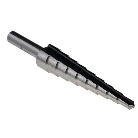 RS PRO Multi-Diameter Step Drill Bit. RS PRO high speed molybdenum steel step drill bit for rapid drilling and deburring in sheet materials up to 3 mm thick. The cone shape unique design of the RS PRO step drill bit allows various popular hole sizes to be drilled with just one tool. This drill bit eliminates vibration and chatter and provides clear holes in applications requiring small hole size increments in stainless steel, aluminium and plastic. Features and Benefits:. ;ul> ;li>High quality drill bit - easy to enlarge holes ;/li> ;li>One tool that can drill various sizes ;/li> ;li>Reduced vibration ;/li> ;li>8 Step ;/li> ;li>Drilling diameter 4 to 12 mm ;/li> ;li>Single cutting flute with self-starting non-skip tip ;/li> ;li>Increments of 1 mm ;/li> ;/ul>. Application Information. Step drill bits are typically used in electrical, plumbing and HVAC applications. They are used for drilling multiple sized holes without the need to frequently change bit sizes. They are compatible with corded or cordless power tools. RS PRO HSS step drill bits are the ideal choice for all your drilling in industrial applications. FAQs. Why would you buy a step drill? A step drill is a single piece accessory with optimised flute angles. It offers a unique tip design that eliminates movement and increases drilling speed. They are compatible with any power tool that incorporates a chuck, for example; cordless drill drivers What material will it drill through? Typical materials include: Stainless steel Aluminium Soft metals Plastics How good step drill bits? A step drill bit is an accessory that gets overlooked, the working principle is so simple you can drill multiple size holes without changing the bit and achieve a nice clean finish every time. Can a step drill bit be used with a stationary drill machine? Yes, step drill bits are compatible with portable hand power tools as well a stationary drilling machines.