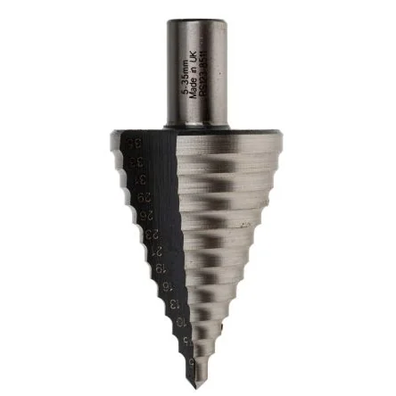 RS PRO High-Speed Steel (HSS) Step Drill Bits. RS PRO range of HSS step drill bits offers advantages over conventional drilling and cutting methods and can be used for many different industrial applications. The cone shape unique design of the RS PRO step drill bits allows various popular hole sizes to be drilled with just one tool. HSS Step Drill Bit Options:- ; 123-8508 123-8508 - 10 Steps, 6 to 30.5 mm step drill bit 10 mm shank ; 123-8509 123-8509 - 12 Steps, 6 to 30 mm step drill bit 10 mm shank ; 123-8510 123-8510 - 9 Steps, 4 to 12 mm step drill bit 6.5 mm shank ; 123-8511 123-8511 - 13 Steps, 5 to 35 mm step drill bit 13 mm shank ; 123-8512 123-8512 - 16 to 32 mm conduit entry step drill ; 123-8513 123-8513 - 10 Steps, 4 to 22 mm step drill 10 mm shank ; 123-8514 123-8514 - 16 to 25 mm conduit entry step drill ; 123-8515 123-8515 - 12 to 25 mm Clearance ; Tapping step drill. Features and Benefits:. ;ul> ;li>High quality drill bit and easy to enlarge holes ;/li> ;li>One tool that can drill various sizes ;/li> ;li>Reduced vibration ;/li> ;li>Faster drilling rate ;/li> ;li>Available in sizes ;/li> ;/ul>. Application Information. Step drill bits are typically used in electrical, plumbing and HVAC applications. They are used for drilling multiple sized holes without the need to frequently change bit sizes. They are compatible with corded or cordless power tools. RS PRO HSS step drill bits are the ideal choice for all your drilling in industrial applications. FAQs. Why would you buy a step drill? A step drill is a single piece accessory with optimised flute angles. It offers a unique tip design that eliminates movement and increases drilling speed. They are compatible with any power tool that incorporates a chuck, for example; cordless drill drivers What material will it drill through? Typical materials include: Stainless steel Aluminium Soft metals Plastics How good step drill bits? A step drill bit is an accessory that gets overlooked, the working principle is so simple you can drill multiple size holes without changing the bit and achieve a nice clean finish every time. Can a step drill bit be used with a stationary drill machine? Yes, step drill bits are compatible with portable hand power tools as well a stationary drilling machines.