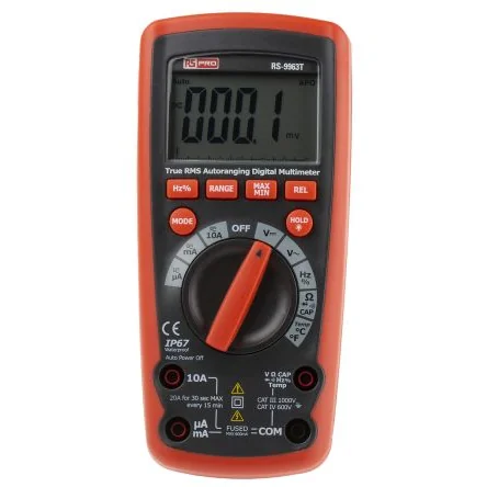 RS PRO Digital Multimeter True-RMS IP67 This high performance handheld digital multimeter from our own brand RS PRO features a variety of electronics measurement functions including frequency, resistance, capacitance, diode test, continuity. The device features True-RMS for excellent precision when testing, with results clearly displayed via an LCD display screen. Additional functions included such as data hold allows you to freeze measurements for future reference, whereas the MAX/MIN feature allows you to hold either the maximum reading or minimum, providing precise results. The multimeter is housed in a double molded enclosure with an IP67 rating, offering excellent protection with water resistant properties. Features and benefits • User friendly interface • True-RMS for excellent precision • Data hold function allows you to freeze measurements for future reference • Large high contrast 6000 count LCD display with backlight feature • Safety category CAT III, CAT IV 1000V • Variety of functions including frequency, resistance, capacitance, diode test, continuity • A range of functions measured including AC Current, AC Voltage, Capacitance, DC Current, DC Voltage, Resistance • Auto power off function to preserve battery life • Test leads included • Double molded enclosure with IP67 rating offering excellent protection and water resistance Applications Digital Multimeters are a type of measurement device used to test and measure a range of electrical properties such as voltage (volts), current (amps) and resistance (ohms). Using a digital output readout, the digital multimeter is connected to a device and measures typically the voltage and any resistances, giving you an output you can measure. Digital multimeters offer a wide range of AC and DC measurement capabilities to suit a variety of applications. Multimeters are essential tester tools for carrying out electrical work from home renovations to large scale installations. FAQs What is the IP rating? The IP rating refers to the level of protection offered by the enclosure of the device. The first number relates to the level of protection from solids such as dust, where as the second digit relates to liquid. The higher the IP rating, the higher the level of protection will be. This device features an IP67 rating, offering protection from dust ingress and water. Is this calibrated? This model is available with the following calibration: RS CAL - (1469138) 1469138 UKAS CAL - (1469139) 1469139 Does this include a continuity check? Yes, this device features a continuity check feature. Does it feature an audible signal? Yes, if the resistance is less than approximately 30O, an audible signal will sound. Does this come with test leads? Yes, test leads are provided with this multimeter.
