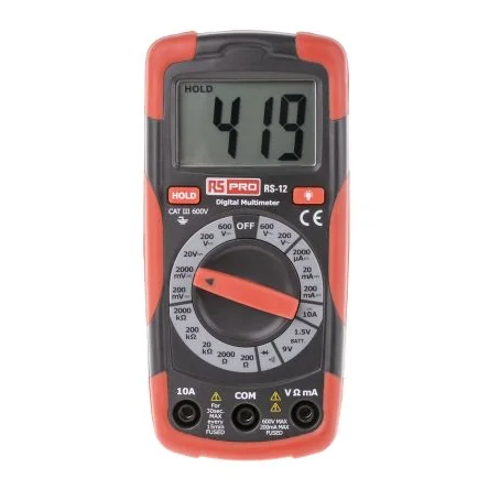 EN61010-1 CAT III 600 V. . RS PRO RS12 Digital Multimeter Manual-Ranging. The RS PRO RS12 digital multimeter (DMM) is a handheld tool which can measure capacitance, voltage, current, resistance and temperature. It comes with manual ranging so you can select the range you desire via the dial on the front of the device. There is also a hold function available in the compact design making it very user-friendly. The RS12 multimeter is also CAT III rated for 600V. Measuring diode, voltage, current, resistance and temperature the battery powered device is great for continuity and portability. A robust, double-moulded, plastic housing provides ultimate protection from harsh environments. Included with the multimeter itself are electrical test leads, type K temperature probe, 9V battery and a user manual. The RS12 is RS Approved, meaning not only is it great value for money, but you can rely on its quality. Features and Benefits:. • Compact and handheld • Digital 2000 count LCD backlit screen • 3 year warranty • 150 x 70 x 48mm dimension • Continuity tester. Typical Applications: A digital multimeter is a handy test tool that measures electrical values such as voltage, current, and resistance. A DMM is used by technicians in the following areas: Electrical and electronic industries Safety guidelines When using any electrical test equipment it is advised that you refer to the user ‘s manual for proper working operating procedures and safety precautions in order to avoid potential safety hazards. What is the difference between an analogue and a digital multimeter? The main difference is the display. A digital multimeter will show the results as numbers on a screen (usually a LED or LCD screen) whereas the analogue version has a needle to show the value.