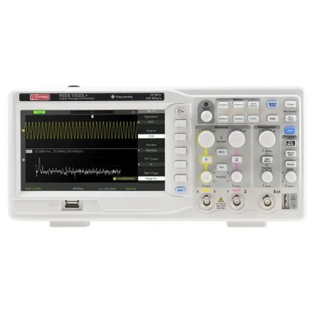 Passive probe 1:1/10:1 (x2), USB cable, quick start guide, quality certificate, power cord, CD (includes user manual and EasyScopeX software). 3. RS PRO RSDS1000CML+/DL+ Series Digital Storage Oscilloscopes (DSO). RS PRO RSDS1000CML+/DL+ Series is a dual-channel universal digital oscilloscope available in 50 MHz, 70 MHz, 100 MHz and 150 MHz bandwidth models. Options available: ;ul> ;li> ; 1236435 1236435 - 50MHz,2 channels ;/li> ;li> ; 1236436 1236436 - 70MHz,2 channels ;/li> ;li> ; 1236437 1236437 - 100MHz,2 channels ;/li> ;li> ; 1236438 1236438 - 150MHz,2 channels ;/li> ;/ul> All models have a 7 inch (177.8 mm) TFT LCD (800 x 480) screen which provides the space for better seeing and analysing waveform details. The RSDS1000CML+ models include a 2 Mpts memory depth which helps to ensure accurate waveform resolution and to capture longer signal lengths. Along with a 1 GSa/s sampling rate, the SDS1000CML+ supports 32 parameters and common mathematical operations to speed up complex and/or repetitive measurements. The RSDS1000DL+ model has 32 Kpts memory depth and 500 MSa/s sampling rate. Features and Benefits. ;ul> ;li>Choice of 50 MHz,150 MHz, 100 MHz and 70 MHz bandwidth models ;/li> ;li>Real-time sampling rate up to 1 GSa/s (depending on choice of model), equivalent-time sampling rate up to 50 GSa/s ;/li> ;li>Memory depth to maximum 2 Mpts (depending on choice of model) ;/li> ;li>Trigger types Edge, Pulse, Video, Slope, Alternate ;/li> ;li>Waveform math functions+, -, *, /, FFT ;/li> ;li>6 digit frequency counter ;/li> ;li>Supports multi-language display and embedded online help ;/li> ;li>Screensaver from 1 minute to 5 hours ;/li> ;li>Digital filter and waveform recorder function ;/li> ;li>Shortcut storage function key ;/li> ;li>7 inch TFT LCD display with 800 x 480 resolution ;/li> ;li>Multiple interfaces USB Host, USB Device (USBTMC), LAN (VXI-11), Pass / Fail ;/li> ;li>Dimensions 323.1 x 135.6 x 157 mm ;/li> ;li>Weight 2.5 kg ;/li> ;/ul>. Oscilloscopes Accessories. ; 123-6471 123-6471 - black soft carrying case. Typical Applications. Digital oscilloscopes are a complex and multi-functional electronic laboratory instrument used to capture, process, display and analyse the waveform and bandwidth of electronic signals. DSO versions have a memory to store waveforms and display them over a period of time. Oscilloscopes are used in a wide range of industries e.g. ;ul> ;li>Educational laboratories ;/li> ;li>Electronics troubleshooting and measurement ;/li> ;li>Embedded electronics ;/li> ;li>Mixed-signal and video designing ;/li> ;li>Automotive electronics ;/li> ;/ul>. Why RS PRO?. RS PRO is the own brand of RS. The RS PRO Seal of Approval is your assurance of professional quality, a guarantee that every part is rigorously tested, inspected, and audited against demanding standards. Making RS PRO the Smart Choice for our customers.