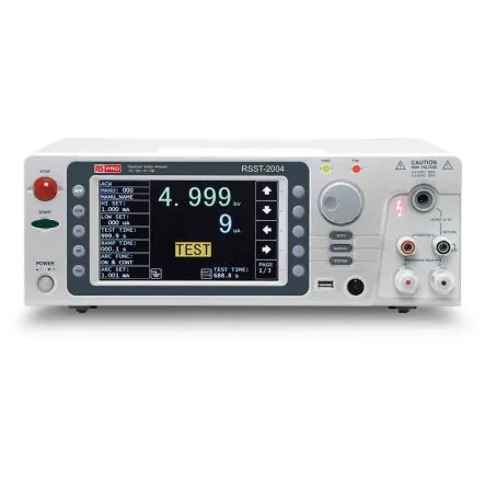 RS PRO RSST-2000 Series Electrical Safety Analyser, RSST-2004 Introducing the RS PRO RSST-2000 Series, the world’s first safety analyser to comply with IEC 61010-2-034. The range has four models to choose from, each catering for a wide range of applications and features for greater functionality, as well as an output capacity of 200 VA. The analysers use a high-efficiency PWM amplifier to effectively exclude the influence from the fluctuating input voltage or distorted waveforms to ensure a stable high-voltage output while conducting AC withstanding voltage test on the DUT to meet safety regulations. The series utilizes 7-inch color TFT LCD and inherits the consistent simplicity key design style of the product family to allow users to experience easy operations and a clear observation of the test results. When convenience and precision is required in electrical safety applications, this range of RS PRO testers sets a reliable standard. Features and Benefits: This range of RS PRO electrical safety testers provides a high-quality and high-efficiency solution to any electrical testing needs with an output capacity of 20 VA Each model has been designed with a 7-inch colour TFT LCD and consistent simplicity in its style to ensure that measurements can be interpreted quickly and easily It has also been designed with a high-efficiency PWM amplifier to exclude the influence of fluctuating voltage inputs or distorted waveforms, ensuring a stable high voltage output To comply with IEC 61010-2-034 requirements, the series uses a double insulation design for input power supply and output voltage to enhance user safety The major test functions include AC and DC withstanding voltage tests, ground bond tests and grounding continuity tests The series also gathers superb output adjustment resolution, measurement resolution, controllable voltage ramps up and ramp down time settings and upper/lower limit judgement settings In addition to this, the high illumination LED lights (flashing or permanently lit) and a high-volume audio indicator are included to provide warnings of the status during on-going tests or judgement results from the safety analyser Other functions and features of the RSST-2000 range includes 100 sets of manual test memory for the storage of different test conditions; rear output terminal for system integration; front panel remote control terminal mount/rear panel Signal I/O for users to conveniently control the analyser’s output/stop based upon the requirements All the above features of this RS PRO series facilitate a greater flexible execution of the required tests so that users can obtain accurate test and measurement results Applications: Insulation testers or electrical safety testers are a type of device used to test the degradation of electrical devices, parts and equipment over time. Devices like these are ideal for preventing potential equipment failures before they occur and make for an excellent troubleshooting tool. Electrical safety testing is required to ensure the safety compliance of electrical equipment of all kinds. Whether testing during production or for maintenance or electrical inspection purposes, an electrical safety tester is essential. Insulation testers are commonly used in areas such as: Automotive Electrical installation Industry Research Production Workshops What does the electrical tester unit come with? Supplied with: Quick Start Guide x 1 Power cord x 1 CD x 1 (complete user manual) Interlock Key x 1 Remote terminal Cable GHT-119 x 1 Test lead GHT-115 x 1 for RSST-2001/2002/2003 Test lead GHT-115 x 1 GTL-215 x 1 for RSST-2004 What other power supplies are available in this RS PRO range? (201-0446) 201-0446 RSST-2001 AC Electrical Safety Analyser (201-0448) 201-0448 RSST-2002 AC/DC Electrical Safety Analyser (201-0449) 201-0449 RSST-2003 AC/DC/IR Electrical Safety Analyser (201-0450) 201-0450 RSST-2004 AC/DC/IR/GB Electrical Safety Analyser Why RS PRO? RS PRO is our own brand range and brings you a wide range of high-quality, great value products offering you more choice. Trusted by engineers all over the world, every part of every RS PRO product has been rigorously tested against demanding industry standards they’re only given the RS PRO seal of approval if we’re confident of their exceptional quality, which means you can be confident too.
