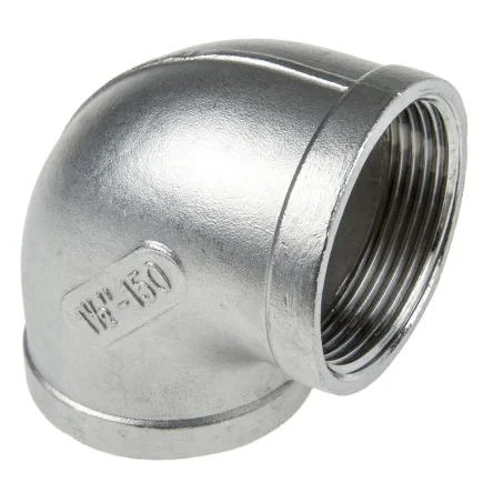 Durable stainless steel 90° elbow fitting for secure plumbing connections.