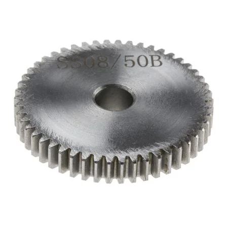 DIN Standard - DIN 867, DIN 3962, DIN 3963, Grade / Quality 9 or equivalent. SSN10/10B and SSN10/12B are hobbed type pinions with cutter runout after the 5 mm gear face width. RS PRO Steel Spur Gears. Use these steel spur gears from RS PRO to get your industrial equipment moving. Our extensive range of spur gears is selected for their high-quality, ease of use and performance while ensuring the correct power, torque multiplication, and speed reduction. To obtain your ideal solution, browse the range using the improved filters to locate the module to suit your application. Also known as. ;ul> ;li>Straight gears ;/li> ;li>Straight-cut gears ;/li> ;li>Spur wheels ;/li> ;li>Spur gearing ;/li> ;/ul>. Features and Benefits. ;ul> ;li>Steel EN8 (080M40/080M46) or equivalent ;/li> ;li>Range of gear ratios ;/li> ;li>Ideally used for speed reduction or increase, torque multiplication, resolution and accuracy in positioning systems. ;/li> ;li>20° pressure angle ;/li> ;li>Metric ;/li> ;/ul>. Applications. ;ul> ;li>Machine Tools ;/li> ;li>Transmissions ;/li> ;li>Speed Reduction ;/li> ;/ul>