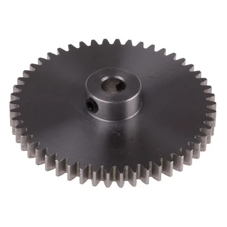 SSN type gears come with M4 grub screws fitted. SSN10/10B and SSN10/12B are hobbed type pinions with cutter runout after the 5 mm gear face width. RS PRO Steel Spur Gears. Use these steel spur gears from RS PRO to get your industrial equipment moving. Our extensive range of spur gears is selected for their high-quality, ease of use and performance while ensuring the correct power, torque multiplication, and speed reduction. To obtain your ideal solution, browse the range using the improved filters to locate the module to suit your application. Also known as. ;ul> ;li>Straight gears ;/li> ;li>Straight-cut gears ;/li> ;li>Spur wheels ;/li> ;li>Spur gearing ;/li> ;/ul>. Features and Benefits. ;ul> ;li>Steel EN8 (080M40/080M46) or equivalent ;/li> ;li>20° pressure angle ;/li> ;li>Metric ;/li> ;li>DIN Standard - DIN 867, DIN 3962, DIN 3963, Grade / Quality 9 or equivalent ;/li> ;li>Standard tolerance, unless otherwise stated ±0.25mm ;/li> ;/ul>. Applications. ;ul> ;li>Machine Tools ;/li> ;li>Transmissions ;/li> ;li>Speed Reduction ;/li> ;/ul>. FAQs. ;I>What is the module? ;/I> A module is expressed as d/N which is the pitch diameter divided by the number of teeth. This explains the size of the gear or qualifies the unit size of a gear based on the number of teeth. Use this parameter to conclude if the gear is compatible.