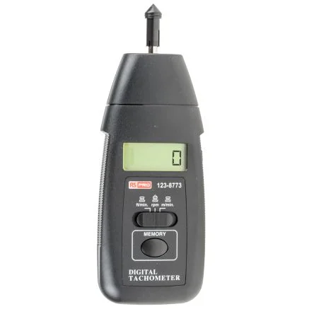 RS PRO 5-digit Single Memory Contact Tachometer. This professional contact tachometer (digital rotary measuring instrument) from RS PRO offers the latest contact measuring technologies in a robust and durable housing and allows for fast and accurate measurements rotational speed, RPM, linear speed and distance. The ergonomically designed body makes it comfortable and an easy to use device at any location. The tachometer and all accessories are supplied in a highly durable plastic case to keep the device safe while not in use. Features and Benefits:. Measures rational speed, RPM, linear speed and distance Clear and easy to read LCD display with a memory function Direct RPM reading function Surface speed units - ft/min or m/min Supplied with a selection of accessories and durable carrying case Calibration Certificate (supplied with a calibrated versions only) 3 Years warranty. Typical applications:. This tool is just as important in the implementation and day to day operations of machinery and systems as it is for maintenance and would also benefit research and development laboratories. Tachometers are typically used for measuring e.g: The speed of rotating equipment such as motors, turbines, fans, wheel, shafts, rollers Travelling speed of belts and conveyors Length of long products such as wire, fibre, steel, wood, etc. The speed of travel and length of sheet products such a films and foils. FAQs:. ;i>Is this tachometer supplied with a battery? ;/i> No, the tachometer is not supplied with batteries. It requires 4 x AA batteries e.g. ; 7442199 7442199 ;i>How does contact tachometer work? ;/i> The contact tachometer's integral spinning wheel sensor has to be placed directly on the rotating shaft or disc then tachometer measures pulses and converts them into RPM, linear speed or distance units. ;i>What do I get in a set? ;/i> The Tachometer is supplied with: Hard Plastic Carry Case RPM Adapter (Cone) RPM Adapter (FUNNEL) Surface Speed Test Wheel Manual