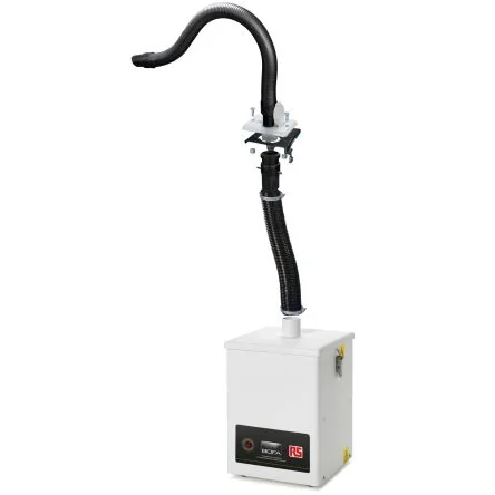 RS PRO RS-E0742 Fume Extraction Unit. From the trusted RS PRO brand, the RS-E0742 solder fume extractor is our cost-effective single-arm fume extraction unit for professional applications. With a robust design and high-efficiency filtering system, this fume extractor guarantees long life and best-in-class low noise levels. This solder fume extraction unit has been designed primarily to extract the fumes generated during hand soldering in the electronics industry. The minimal installation allows this unit to be moved with the workbench when factory layouts need to be changed due to production challenges, making it a flexible and versatile fume extractor unit able to move with the workspace if required. The low noise level extractor and fully comprehensive filtration is ideal for factories with changing production demands. Features and Benefits Filter blocked indicator Unique flip top flush sealing mounting plate Granulated Carbon Gas Filter 99.997% HEPA Filtration Technical Data Dimensions (HxWxD): 380 x 260 x 260mm Cabinet construction: Powder coated mild steel Airflow/Pressure: 90m³/hr / 20mbar Electrical data: 230v 1ph 50/60Hz Full load current: 0.45 amps / 90w Noise Level: ; 54dBA at typical operating speed Weight: 7kg Duct size: 50mm Duct run: 3mtrs Pre filter specifications Filter media: glass fibre Filter media construction: Pad Filter efficiency: F7 (96% @ 2 microns) Combined filter specifications HEPA filter media: Glass fibre HEPA media construction: Maxi pleat construction with webbing spacers Gas filter: Treated activated carbon Filter housing: Zintec mild steel Filter Efficiency: 99.997% @ 0.3 microns Applications In soldering applications, smoke from either lead-free or leaded solder can be hazardous to health, and so an extraction system is required to ensure worker safety. In any application where smoke or hazardous vapor is a problem, specialist extraction units should be used. This particular compact-sized extractor is ideal for; Soldering Tip soldering Rework Lead-free Package Includes RS-E0742 extraction unit 1 x Pre filter pad 1 x Combined HEPA/Gas filter 1 x Power cable 1 x Installation flex and table bracket 1 x 50mm ESD Stay Put extraction arm Why RS PRO? RS PRO aims to be your go-to brand for reliability and value for money. We source high-quality parts at great prices and test everything with our in-house experts to ensure the quality you need. When it comes to tools, we know that versatility and dependability are what you need. As such, we stock a variety of mainstay and specialist tools to suit any application. Whether you're a professional electrician, plumber, builder or DIY enthusiast, RS PRO is here to support you.