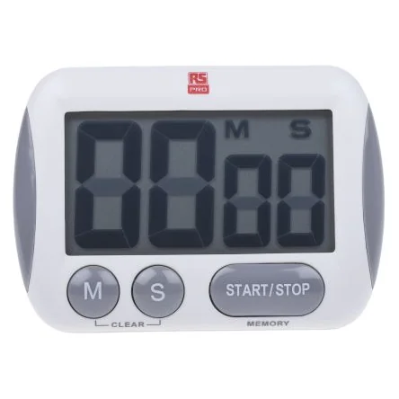 RS PRO Digital Desktop Timer With Jumbo Display. Introducing the digital desktop timer from our trusted and reliable own brand RS PRO, a compact timer ideal for a range of applications that require a specific time to be elapsed or measured. The compact design and 1 x AAA battery operation means that the timer can easily be transported and used in a range of environments, making it a versatile timer. This handy desktop timer can count up and down to/from 99 min, 59 sec with a jumbo LCD display that allows you to clearly see the time elapsed, with a built in audible alarm to notify you once the count down/up has ended. If the timer is intended for office or home use, the built-in stand ensures that it can be securely placed on a flat surface, whereas the clip allows you to attach it to an accessory such as a belt, for improved portability. At RS, we also offer calibrated versions for this compact timer including: UKAS calibration ( ; 134-7550 134-7550 ). Features and benefits. • Jumbo LCD display to clearly display time elapsed • Audible alarm at the end of the count down period • Operated by 1 x AAA battery (included) • Compact design with clip allowing you to easy transport it • Built-in stand ensuring the timer can be displayed up right on a flat surface • Count up or down, making it a versatile timer suitable for a range of applications. Applications. This compact timer can be used in a variety of applications that require elapsed time to be measured such as: • Sporting events • Competitions • Cooking • Meetings • Lectures. What batteries does this require?. The RS PRO desktop timer operates using a 1 x AAA battery, which is also supplied. Is there an audible alarm?. This timer features an audible alarm once the count down or up time has been achieved, providing enhanced notification when the timer is not to hand. What is the max time achievable?. The max time achievable with the RS PRO desktop timer is 99 minutes, 59 seconds.