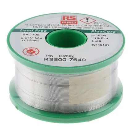 Flux classification per J-STD 004 is ROL0 - leaves a highly reliable post-soldering residue. RS PRO Lead-Free Solder Wire. From teh trusted RS PRO brand, this lead-free solder wire from RS is a resin-based SAC305 solder wire. SAC305 is a specially-formulated lead-free alloy that contains 96.5% tin, 3% silver and 0.5% copper. SAC305 alloy comes under the JEIDA recommendation for lead-free solder, conforming to J-STD 006. The solder wire flux is specifically formulated to wet common Printed Circuit Boards (PCB) and components. The residue left after soldering is completely clear and is safe to leave on the PCB post soldering. Features and Benefits • Multipurpose solder wire that can be used for a variety of soldering tasks • Suitable for soldering all products that must be RoHS compliant • Melting point between 217-219°C • Flux content 3.3% • Soldering tip typical temperature for use with this solder wire is 360-400°C Applications Solder is used alongside soldering irons, particularly in securing electrical components to integrated circuit boards. The solder melts easily when heated, and cools quickly, meaning it can be moulded to secure components in place in solder joints. The quick setting nature of solder means it can also be used for light brazing. Because of its relatively low melting point, solder can be reworked easily by heating it to melting point and using a solder sucker to remove it. Solder is commonly used with SMD and through-hole components, with applications in repair, prototyping and production. What are the differences between lead-free solder and leaded solder? Lead-free solder is generally regarded as having a more positive environmental impact than leaded solder, and also as being safer for human use. However, lead-free solder also has potential production advantages. Lead-free solder can offer better lead spacing, which makes it more suitable for high-density components where pitches are tight. This means potentially better performance where space saving is a concern. The advantages of lead solder are that it has a lower melting point, which is sometimes preferable for hand working components. Also, lower working temperatures reduces the risk of damage to components and circuit board. Unlike lead-free solder, lead solder does not have a shelf-life and is less prone to losing quality after prolonged exposure to oxygen. However, many electronic application requirements exclude the use of lead solder, due to the toxicity of lead. Why RS PRO? RS PRO aims to be your go-to brand for reliability and value for money. We source great parts at great prices and test everything with our in-house experts to ensure the quality you need. When it comes to tools, we know that versatility and dependability are what you need. As such, we stock a variety of mainstay and specialist tools to suit any application. Whether you're a professional electrician, technician, engineer or home inventor, RS PRO is here to support you.