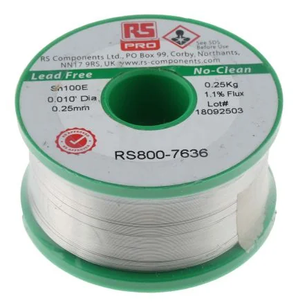 Flux classification per J-STD 004 is ROL0 which leaves a highly reliable post soldering residue. ;i> RS, Professionally Approved Products, gives you professional quality parts across all products categories. Our range has been testified by engineers as giving comparable quality to that of the leading brands without paying a premium price. ;/i>. RS PRO Low-Cost Lead-Free Solder Wire. From the trusted RS PRO brand, this solder wire is a resin-based, SAC305 lead-free solder wire that utilises a synthetically refined resin and effective activator package. The flux formulation of this solder wire is ideal for wetting common Printed Circuit Boards (PCBs) and any components as it leaves behind a clear residue that can be easily removed with dry brushing for a cleaner look or safely left on the PCB after soldering. The alloy used in this solder wire conforms to J-STD 006 and contains 99.5% tin and 0.5% copper for below articles. • ; 800-7677 800-7677 is a 0.8mm 250g lead-free solder supplied on a reel • ; 800-7668 800-7668 is a 1.2mm 250g lead-free solder supplied on a reel • ; 800-7664 800-7664 is a 1.0mm 250g lead-free solder supplied on a reel • ; 800-7630 800-7630 is a 1.02mm 500g lead-free solder supplied on a reel • ; 800-7636 800-7636 is a 0.25mm 250g lead-free solder supplied on a reel The alloy used in this solder wire conforms to J-STD 006 and contains 96.5% tin, 3.0% silver and 0.5% copper for below article. • ; 818-3204 818-3204 is a 0.8mm lead-free solder supplied in a 4m handy pack Features and Benefits • Versatile solder wire that is suitable for a wide range of soldering tasks • Typical temperature of soldering iron tip for use with this solder is 360-400°C • Melting point is 217-219°C • Flux content 3.3% Applications Solder is used alongside soldering irons, particularly in securing electrical components to integrated circuit boards. The solder melts easily when heated, and cools quickly, meaning it can be moulded to secure components in place in solder joints. The quick setting nature of solder means it can also be used for light brazing. Because of its relatively low melting point, solder can be reworked easily by heating it to melting point and using a solder sucker to remove it. Solder is commonly used with SMD and through-hole components, with applications in repair, prototyping and production. What are the differences between lead-free solder and leaded solder? Lead-free solder is generally regarded as having a more positive environmental impact than leaded solder, and also as being safer for human use. However, lead-free solder also has potential production advantages. Lead-free solder can offer better lead spacing, which makes it more suitable for high-density components where pitches are tight. This means potentially better performance where space saving is a concern. The advantages of lead solder are that it has a lower melting point, which is sometimes preferable for hand working components. Also, lower working temperatures reduces the risk of damage to components and circuit board. Unlike lead-free solder, lead solder does not have a shelf-life and is less prone to losing quality after prolonged exposure to oxygen. However, many electronic application requirements exclude the use of lead solder, due to the toxicity of lead. Why RS PRO? RS PRO aims to be your go-to brand for reliability and value for money. We source great parts at great prices and test everything with our in-house experts to ensure the quality you need. When it comes to tools, we know that versatility and dependability are what you need. As such, we stock a variety of mainstay and specialist tools to suit any application. Whether you're a professional electrician, technician, engineer or home inventor, RS PRO is here to support you.