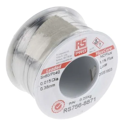 J-STD-004 classification ORL0. RS PRO 60/40 Sn-Pb colophony free solders. From the trusted RS PRO brand, this resin free tin-lead solder is ideal for general purpose soldering in electronic repair and manufacturing. Features and Benefits 60/40 tin/lead solder wire with no rosin (colophony) in flux Resin-free Low level of flux residue Minimal flux residues removed by dry brushing Low odour Applications Solder is used alongside soldering irons, particularly in securing electrical components to integrated circuit boards. The solder melts easily when heated, and cools quickly, meaning it can be moulded to secure components in place in solder joints. The quick setting nature of solder means it can also be used for light brazing. Because of its relatively low melting point, solder can be reworked easily by heating it to melting point and using a solder sucker to remove it. Solder is commonly used with SMD and through-hole components, with applications in repair, prototyping and production. What are the differences between lead-free solder and leaded solder? Lead-free solder is generally regarded as having a more positive environmental impact than leaded solder, and also as being safer for human use. However, lead-free solder also has potential production advantages. Lead-free solder can offer better lead spacing, which makes it more suitable for high-density components where pitches are tight. This means potentially better performance where space saving is a concern. The advantages of lead solder are that it has a lower melting point, which is sometimes preferable for hand working components. Also, lower working temperatures reduces the risk of damage to components and circuit board. Unlike lead-free solder, lead solder does not have a shelf-life and is less prone to losing quality after prolonged exposure to oxygen. However, many electronic application requirements exclude the use of lead solder, due to the toxicity of lead. Why RS PRO? RS PRO aims to be your go-to brand for reliability and value for money. We source great parts at great prices and test everything with our in-house experts to ensure the quality you need. When it comes to tools, we know that versatility and dependability are what you need. As such, we stock a variety of mainstay and specialist tools to suit any application. Whether you're a professional electrician, technician, engineer or home inventor, RS PRO is here to support you.