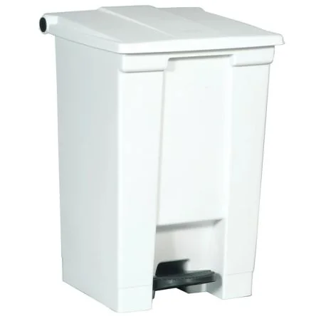 This 12-gallon white pedal waste bin by Rubbermaid is made of durable plastic for easy waste management.