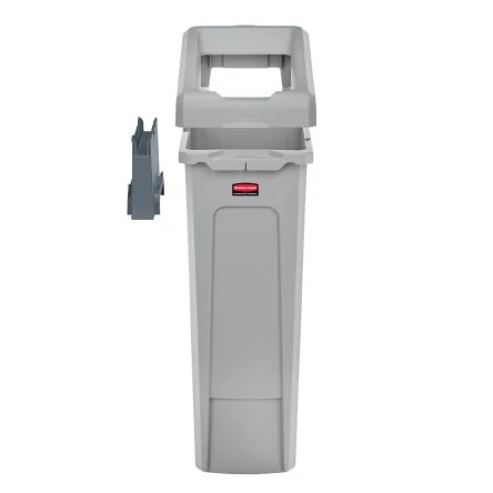 The Rubbermaid Commercial Products Slim Jim Recycling station offers a front-of-house look with back-of-house functionality.Intuitive lid openings help patrons and staff sort recyclables more effectively Provide better waste stream visibility by selecting a colour and waste stream label for your facility needs Hinging lid inserts are optimized to fit any size recyclable Simple and durable execution Components snap in place without the use of hardware