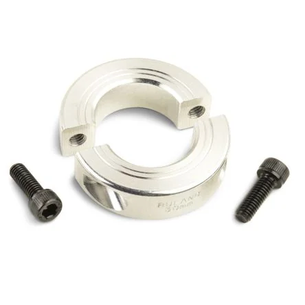 Aluminium Collars. Clamp shaft collars do not mar the shaft, are easy to remove and are indefinitely adjustable. They are commonly used for guiding, spacing, stopping, mounting and component alignment. Equipment manufacturers benefit from the tightly controlled face to bore perpendicularity of Ruland shaft collars (TIR of = 0.002" or 0.05 mm). Perpendicularity is critical for alignment when the shaft collar is used as a load bearing face, mechanical stop or for mounting components such as gears or bearings. Proprietary processes have been developed by Ruland to maintain superior fit, finish, and holding power. Ruland stamps the name and bore size on every shaft collar for ease of identification. 2 piece styles are mated throughout the manufacturing process for proper fit and alignment. Forged screws test beyond DIN 912 12.9 to ensure maximum holding power. All shaft collars are machined from solid bar stock to a fine burr free finish and sourced exclusively from North American mills. Ruland uses high grade 2024 aluminium for increased screw seating torque. All products are RoHS2 and REACH compliant and manufactured in our Marlborough, MA factory. One and two piece collars in aluminium Collars do not score the shaft Easily installed and adjusted