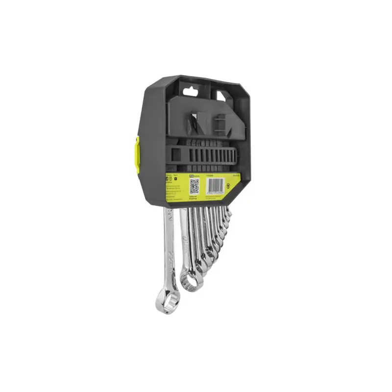 The RYOBI 12-piece mixed angle wrenches set - Return angle 15° - RHWR8PC is a tool set that offers versatility and allows you to work in tight spaces. The wrenches range from 8 to 22 mm and all have a return angle of 15°. The chrome vanadium steel design ensures resistance to corrosion and makes cleaning easy. The wrenches are sold in a case compatible with Ryobi's LINK system.