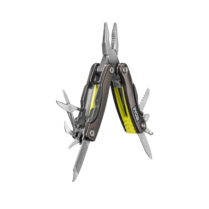 The RYOBI 14-in-1 Multi-Tool Pliers - RMT14 will allow you to have several tools combined into one for greater versatility and space-saving. These pliers serve as a needle-nose pliers, pipe wrench, scissors, nail file, 2 side files, awl, can opener, wire cutter, saw, knife, screwdriver, flathead screwdriver, and bottle opener. Thanks to its compact size, you can take it anywhere.