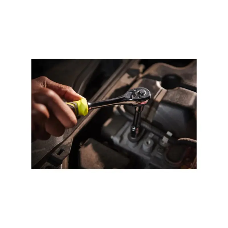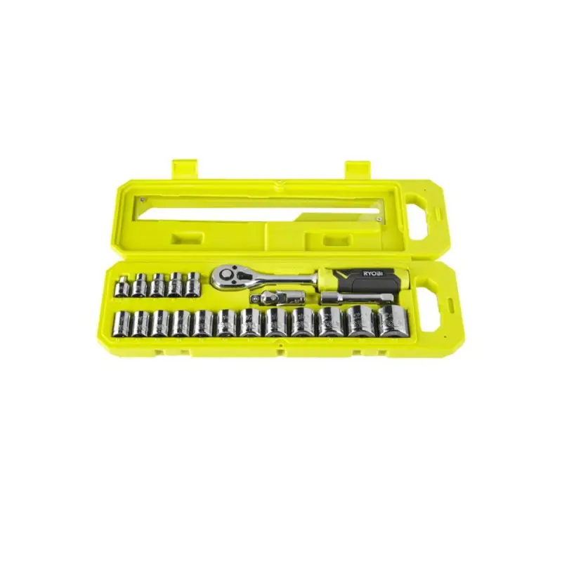 The RYOBI 16 Socket and Accessory Set - 90 Tooth Wrench - RHRS20PC includes sockets ranging from 7 to 24 mm, as well as a 90-tooth wrench, a Hex 1/4 to Hex 3/8 adapter, and an extension. With all these pieces, you will have versatility for your tasks. This set is portable due to its compact size. It is also compatible with Ryobi's LINK system.