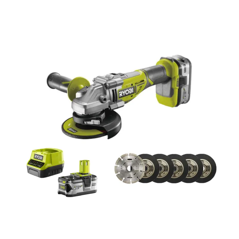 RYOBI 18V LithiumPlus One+ Brushless Angle Grinder - 1 x 4.0 Ah Battery - 1 x Fast Charger - R18AG7-140S: