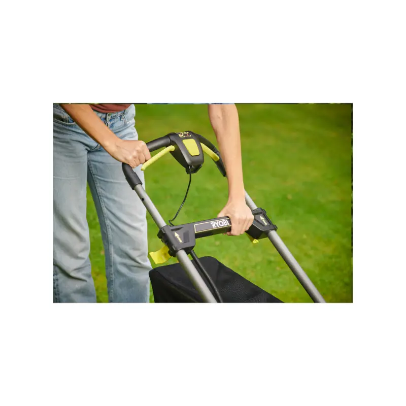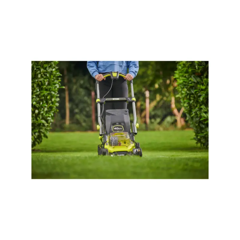 ThisRYOBI 18V Brushless mower - 40cm cutting width - Without battery or charger is ideal for mowing your lawn efficiently and comfortably, particularly thanks to its adjustable ergonomic handles and centralized height adjustment. You can cut your lawn up to 40 cm wide, and it has a semi-rigid 50 L grass collector. Additionally, it is equipped with a brushless motor technology that provides more power and a high-quality cut similar to petrol-powered devices. The mower has a compartment to store a second battery, ensuring you always have one on hand if the first is discharged.