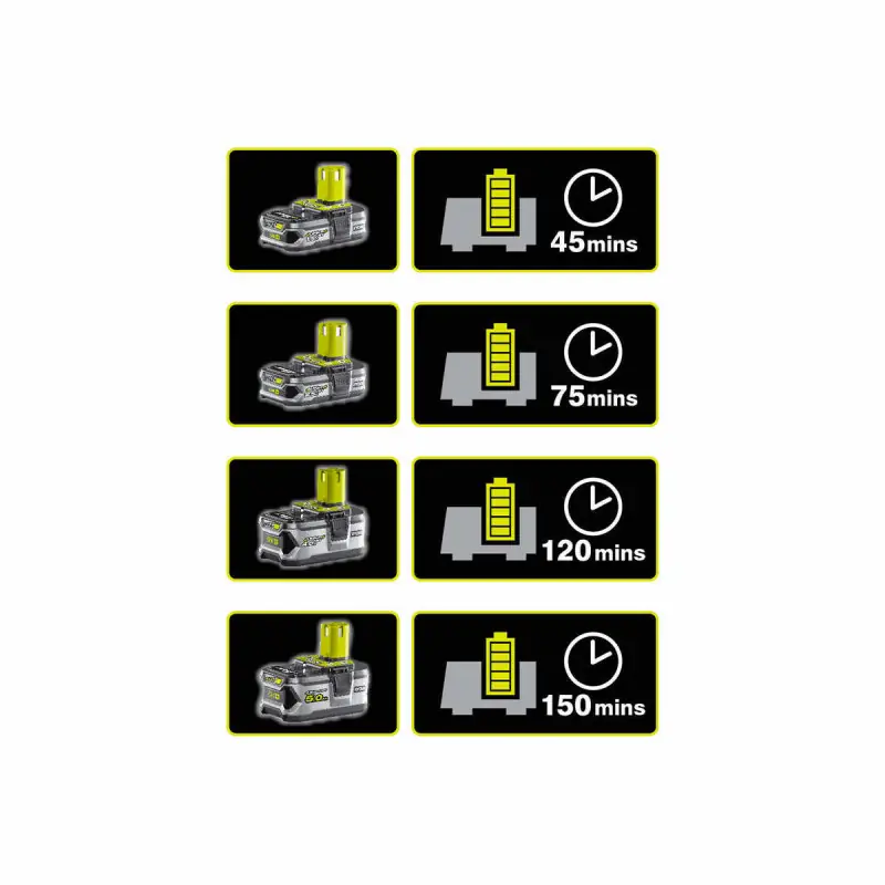 ThisRYOBI pack consists of two 5.0Ah batteries and a fast charger. These accessories are compatible with all garden and DIY tools in the 18V One+ range. The batteries feature Lithium+IntelliCell technology, ensuring a high level of autonomy for continuous or intensive work. For example, they offer over 25% more autonomy compared to 4.0Ah batteries. You can keep an eye on the charge level thanks to 4 indicators (25% each), and even when the total discharge is near, your tool will continue to operate at full power. For better longevity, the batteries are equipped with electronic protection against overcharging and overheating.