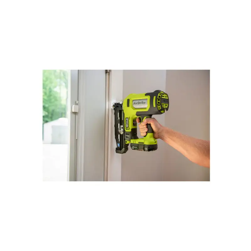 RYOBI 18 V One+ R16GN18-0 Air Compressor Finish Nailer Pack - 1 Battery 2.5Ah - 1 Fast Charger RC18120-125 with a nailer that features AirStrike technology, allowing you to avoid the hassle of a compressor or using gas cartridges. The magazine can hold up to 100 nails ranging from 19 to 64 mm in length and 1.6 mm in width. The nailer is equipped with a convenient jam release and will not fire if the magazine is empty. An LED light is located at the front to illuminate the work area if it is dark.
