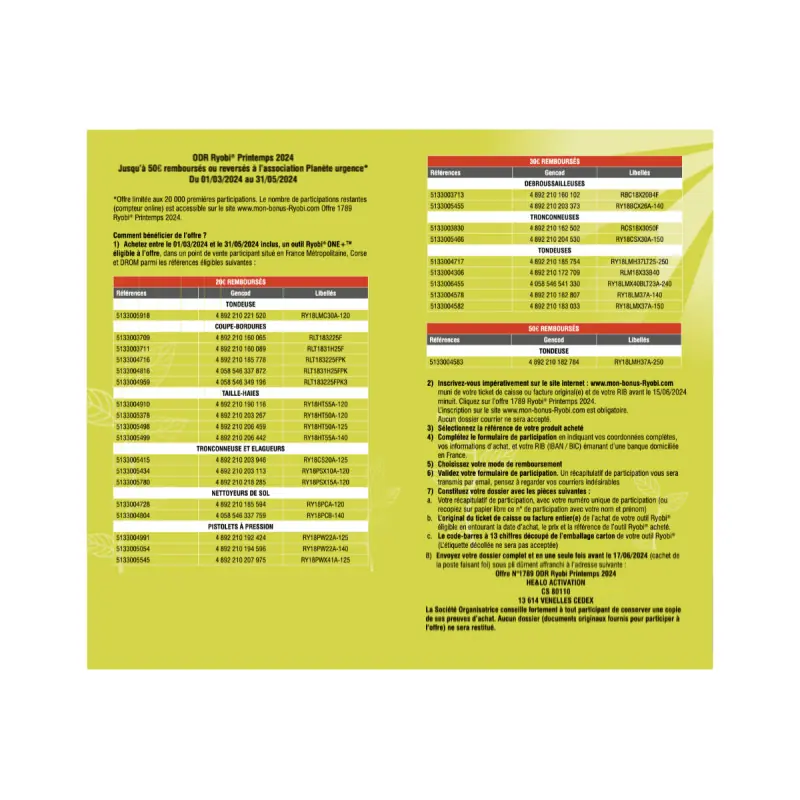 • When you buy your RYOBI tool, go to the my RYOBI bonus website, click on the banner for the offer 1789, and fill out the form before 15/06/2024. Applications without prior registration will not be considered. No postal applications will be accepted.
