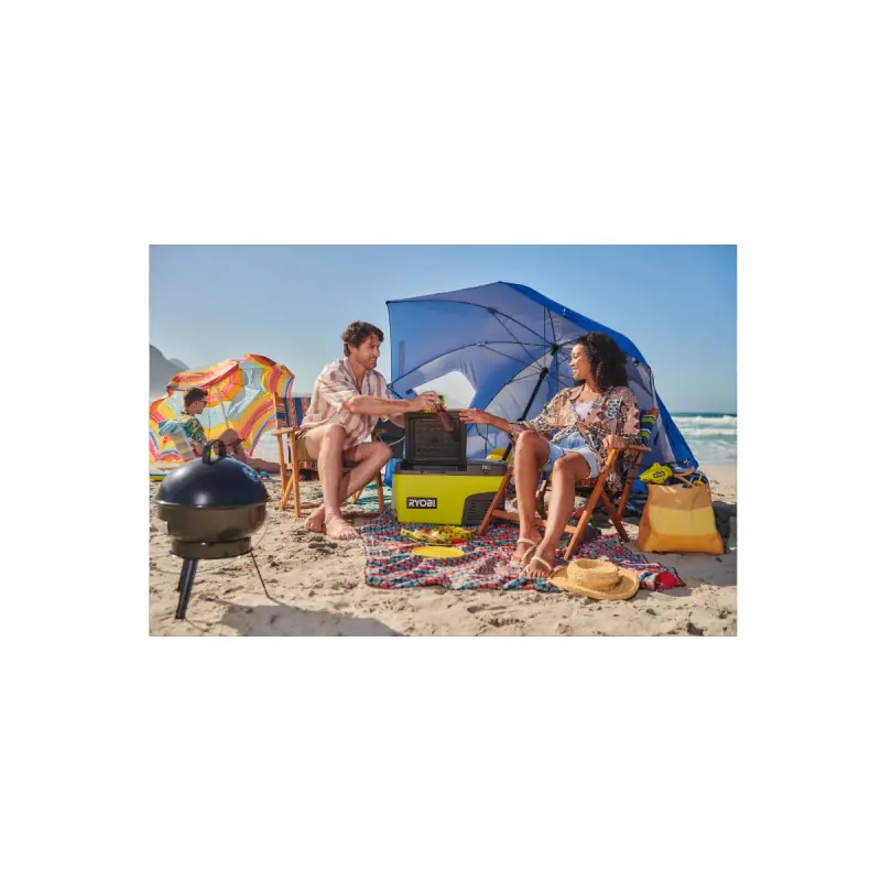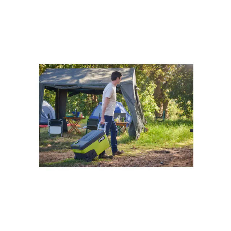 ThisRYOBI 18V One+ Hybrid Wheeled Cooler - 23 L - Without battery or charger - RY18CB23A-0 operates either wired or on battery (sold separately). It allows you to take drinks and food with you while keeping them cool, making it an ideal companion for your picnics or camping trips. With its vertical handle and wheels, you can easily transport it during your outings. In case of battery use, two ports are provided to extend the battery life.