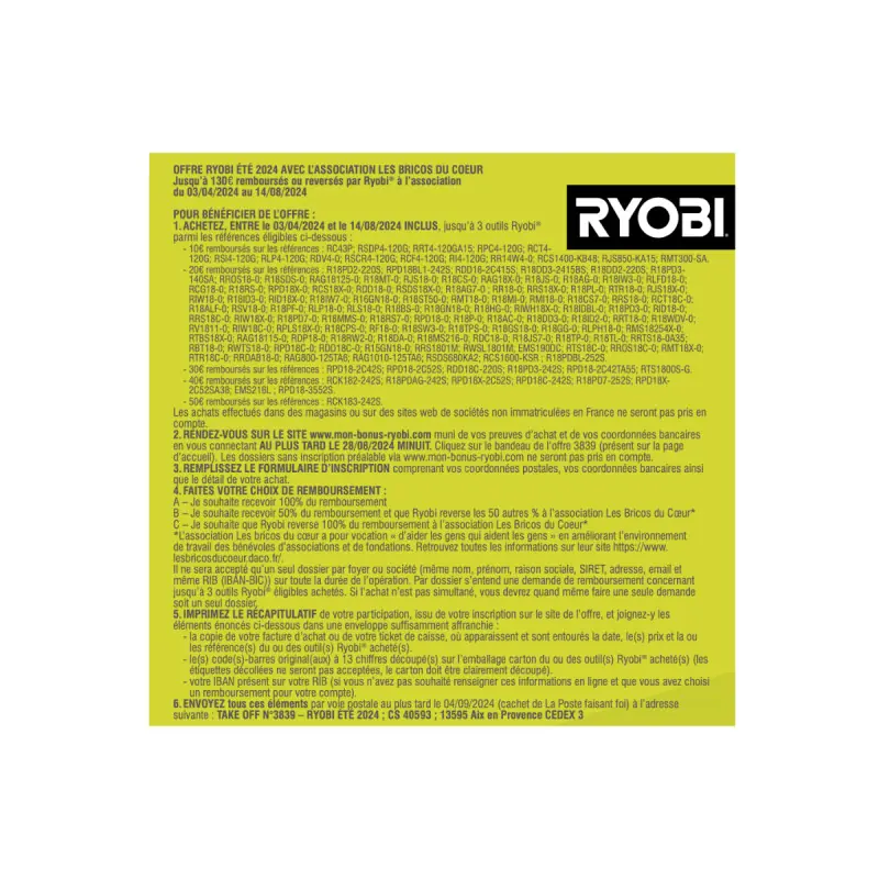 • When you buy your RYOBI tool, keep your proof of purchase and go to the mon Bonus Ryobi website. Click on the banner for offer 3839 and fill out the form.