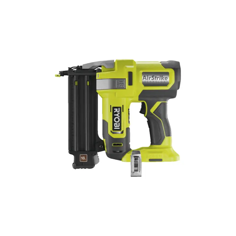 The RYOBI 18V One+ Air Compressor Nail Gun - R18GN18-0 features AirStrike technology, allowing you to avoid the hassle of a compressor or using gas cartridges. The magazine can hold up to 105 nails ranging from 15 to 50 mm in length and 1.2 mm in width. The nail gun is equipped with a convenient jam release and will not fire if the magazine is empty. A LED light is located at the front to illuminate your work area in low light conditions.