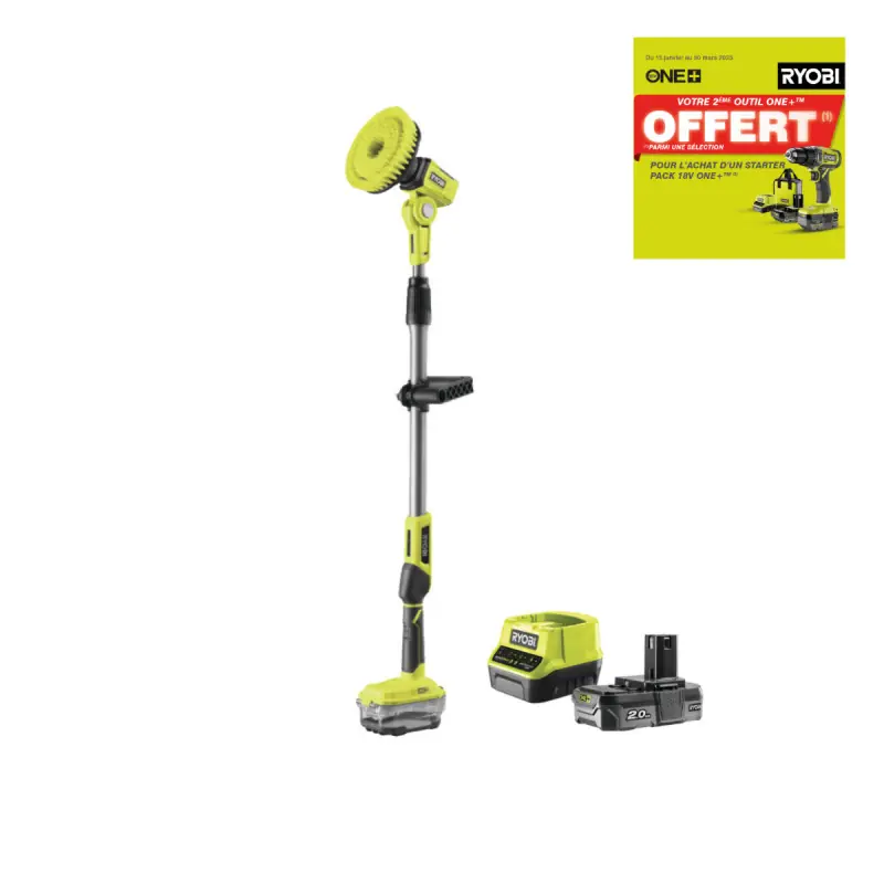 This RYOBI 18V One+ R18TPS-120G telescopic motorised brush and its accessories: its 2.0Ah battery and charger will be ideal for cleaning garage doors and soffits. With this tool, you can clean hard-to-reach areas thanks to the extendable and adjustable pole of 1 to 1.4m in length. This motorised brush will be