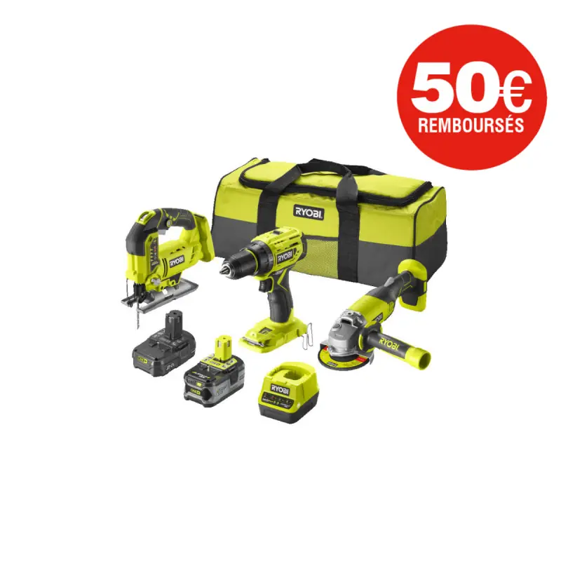 This includes a jigsaw, a drill/driver, and an angle grinder, accompanied by their 2 batteries and charger. You will thus be able to meet all your needs and use all your 18V One+ tools with the same batteries. Transport is greatly facilitated thanks to the carrying bag!