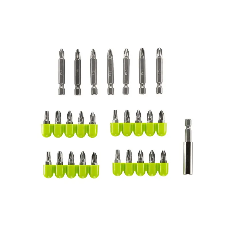 RYOBI 28 Piece Screwdriver Bit Set with RAK28MSD Storage Racks complete kit of 28 screwdriver bits with a storage rack, ideal for your job sites and workshops. Contains 20 bits of 25 mm, 7 bits of 50 mm, and 1 magnetic bit holder of 60 mm.