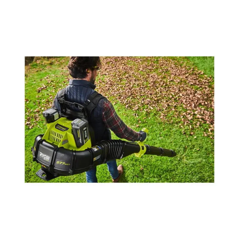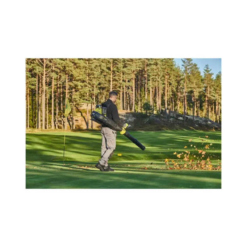 TheRYOBI 36V Whisper Brushless Backpack Blower - Blowing Speed 277 km/h - Without Battery or Charger - RY36BPXB-0is suitable for the most demanding blowing tasks in a driveway, on a patio, or in a large garden. This blower belongs to the Whisper range, combining an exceptional blowing speed of 277 km/h while minimising noise disturbances. Additionally, it features a Brushless motor that enhances its performance and power. The air flow and Turbo Boost button will allow you to clear significant or wet debris effortlessly, even on large surfaces. Unlike a traditional blower, this one is worn on your back with a harness, making prolonged use less tiring. The power compartment can accommodate two batteries for extended use if needed (the blower also operates with a single battery). The device is compatible with all 36V Max Power batteries (sold separately).
