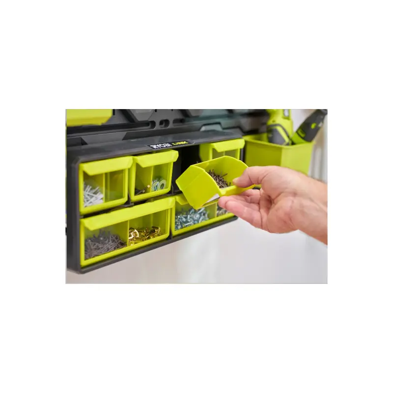 ThisRYOBI adjustable organiser for Link System - RSLW309is made up of various removable compartments to help you organise your consumables or accessories as you wish. It is used with the Link system to optimise storage in your workshop or garage.