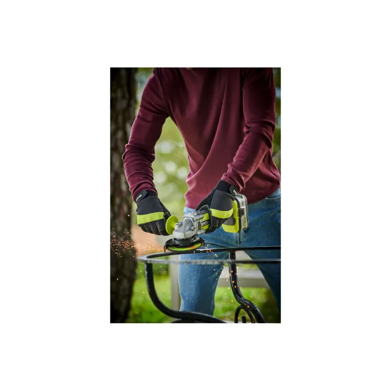 RYOBI Angle Grinder Pack R18AG7-0 - Brushless 18V One+ - 1 battery 2.0Ah - 1 fast charger RC18120-120 perfect pack for working with metal, stone, breeze blocks, cement, marble, etc. Battery and fast charger included. Its 3-position auxiliary handle with anti-slip coating offers a better grip on the machine for optimised comfort.