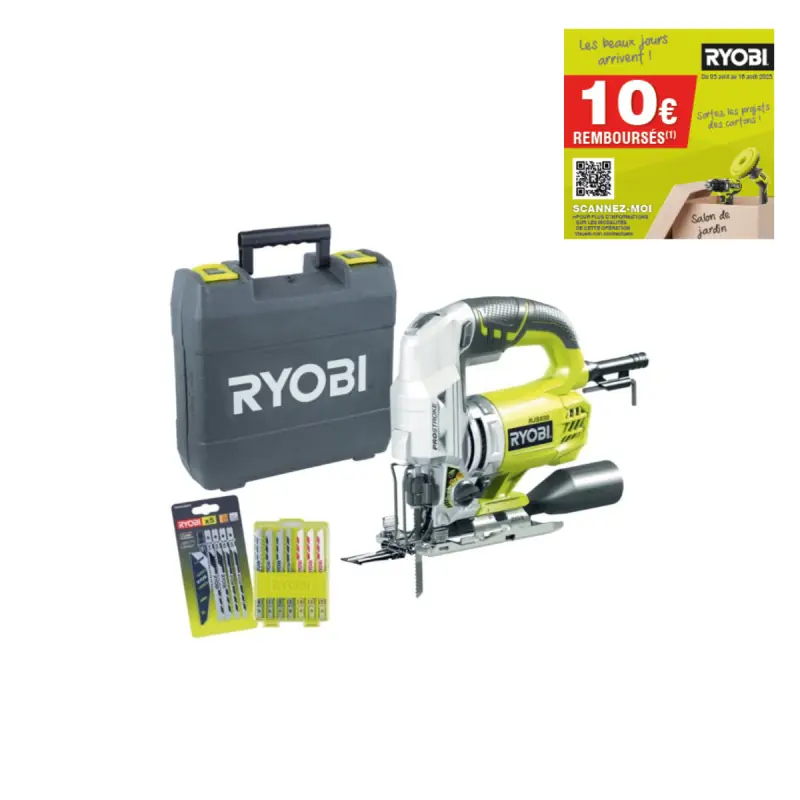 The RYOBI corded jigsaw and accessories - 600 W - RJS850KA15 is ideal for your woodworking projects. With a power of 600W, it allows for perfect and straight cuts on wood. Equipped with a wood blade, a hex key, and a dust extraction nozzle. Supplied with a case of 15 blades for various uses.