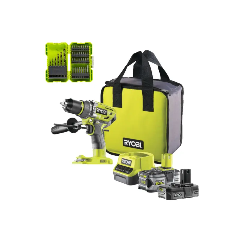 ThisRYOBI Brushless Cordless Hammer Drill Driver Pack R18PD7-252S - 2 batteries 5.0 - 2.0Ah - Charger - 38 drilling-screwing accessories RAK38SDD is ideal for use on hard materials. Its GripZone bi-material handle technology provides a firm and comfortable grip, as well as better control of the tool, which is very practical on all types of materials. The tool is sold with two batteries of 2.0Ah and 5.0Ah that offer great working autonomy. Also included in the pack is a fast charger and a case containing 38 accessories for the most common drilling and screwing tasks.