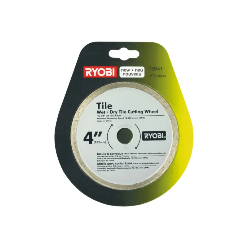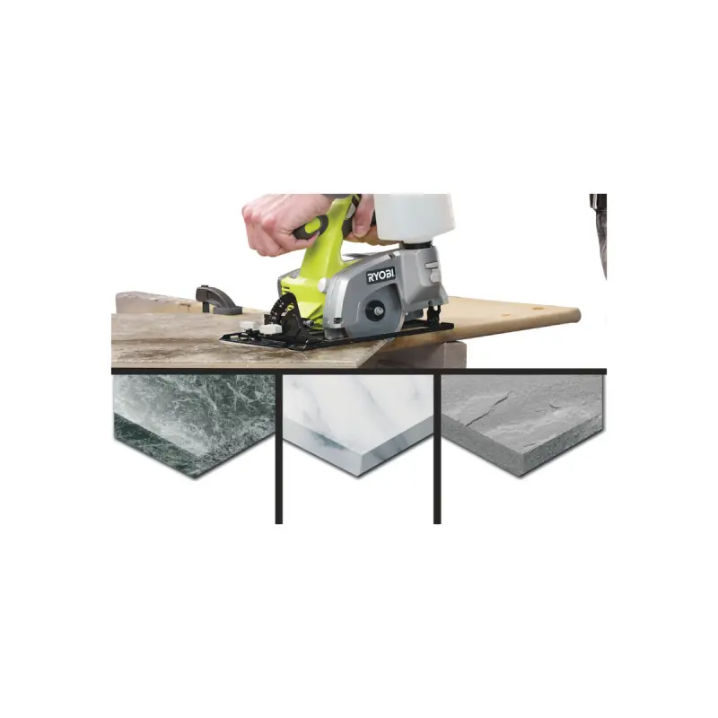 ThisRYOBI packand itsLTS180M tile saw - 18V One+ - 102 mm wheel - without battery or chargerfeatures a powerful motor that allows for easy cuts on granite ceramics marble and concrete. The 102mm continuous rim diamond blade offers maximum cutting quality whether dry or wet while minimising chipping. Its bi-material GripZone handle technology provides a firm and comfortable grip as well as better control of the machine. It operates with a Ryobi 18V One+ battery sold separately. ATSBA1 cutting discis included in the pack.