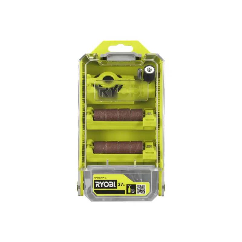 This RYOBI multi-purpose kit - RAR800K-37 - 3.2mm - 37 pcs includes 37 accessories compatible with all mini-tools featuring a 3.2mm chuck. They are designed to carry out all types of small jobs on wood, metal, and plastic.
