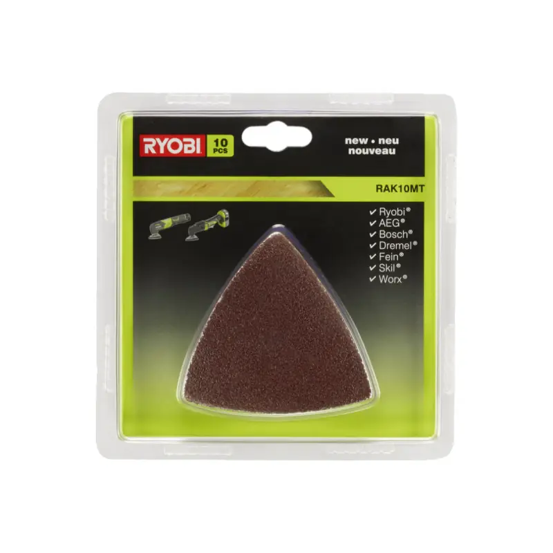 ThisRYOBI packwith itsmultitool R18MT-0 - 18V One+ without battery or chargerand interchangeable accessories will allow you to work in tight spaces thanks to a head with 4 positions and a 90° rotation. A speed selector and a variable speed control will make your task easier, and you will benefit from an optimal grip with the micro-cellular GripZone™ handle. This tool operates with a Ryobi 18V One+ battery sold separately. Akit of 10 abrasive triangles RAK10MTis included in the pack.