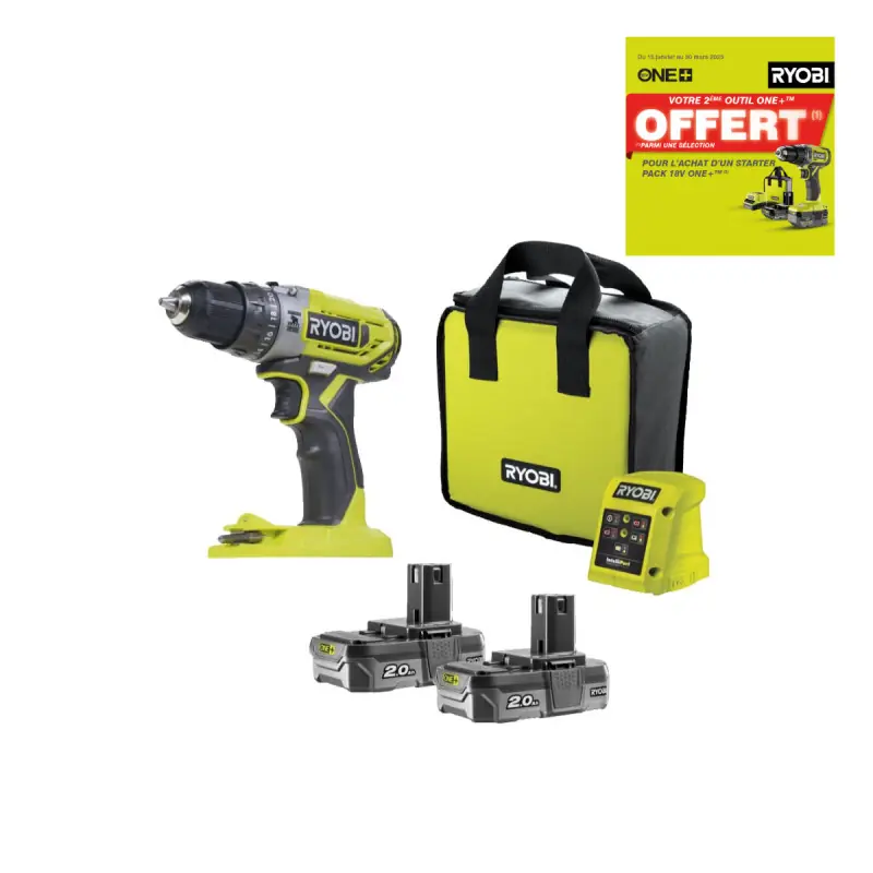 The RYOBI One+ 18V Cordless Hammer Drill - 2 batteries 2.0 Ah - 1 charger - R18PD2-220S includes a 18V cordless drill, two 2.0 Ah batteries, a charger, and a carrying bag. Powerful and durable, the drill allows you to easily drill into wood and metal, making it suitable for all your indoor and outdoor tasks.