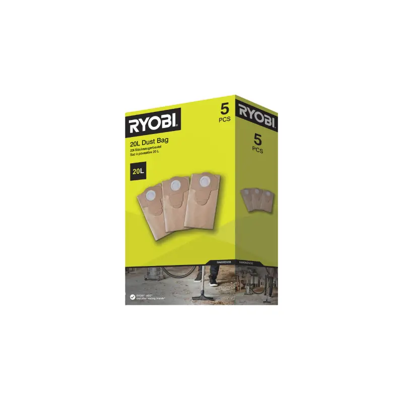 This pack of 5 RYOBI dust bags - 20 L - RAKWDV05 is compatible with the ONE+ R18WDV-0 vacuum cleaner and all RYOBI 20 L vacuum cleaners.