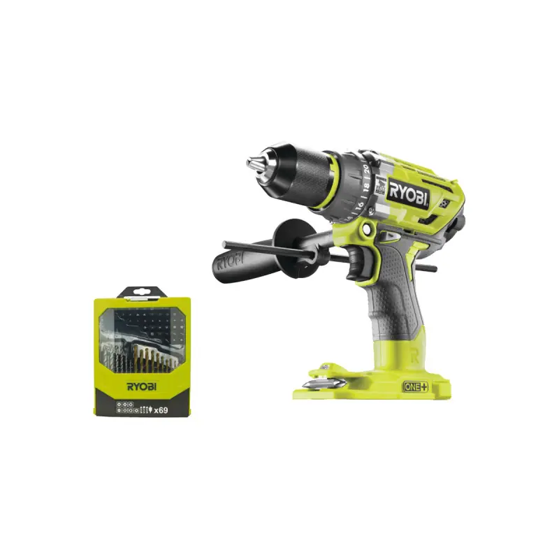 This RYOBI pack includes a R18PD7-0 Brushless One+ percussion drill/driver - without battery or charger ideal for use on hard materials. Its GripZone bi-material handle technology provides a firm and comfortable grip, as well as better control of the machine, which is very practical on all types of materials. It operates with a battery from the Ryobi 18V One+ range sold separately. The pack includes a 69-piece drilling and driving accessory set RAK69MIX.
