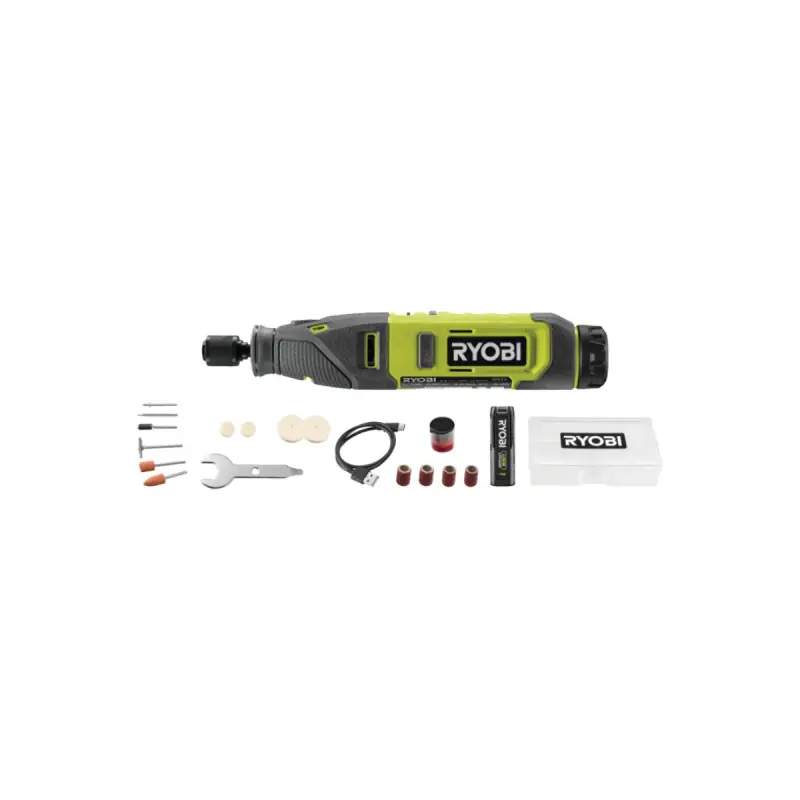 1 x RYOBI RPC4-120G multifunction mini-tool - 4V 1 x 2.0Ah Battery 1 x USB C Cable 1 x Key 1 x Storage box for accessories 2 x Polishing discs 12.7 mm 2 x Polishing discs 25.4 mm 1 x Steel brush 1 x Polishing paste 2 x Sanding strips grit 60 2 x Sanding strips grit 120 1 x Cylindrical grinding wheel 9.5 mm 1 x Conical grinding wheel 9.5 mm 1 x Chuck Ø 3.2 mm 1 x Chuck Ø 3.2 mm for sanding strips 1 x Engraving bit Ø 3.2 mm Delivered in its original packaging