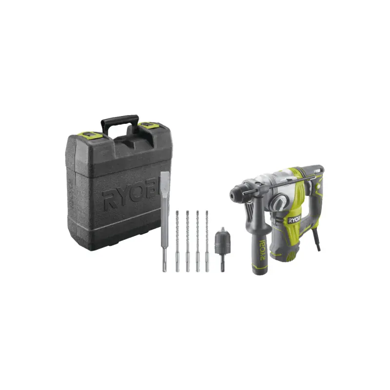 ThisRYOBI packincludes aRSDS800-KC Rotary Hammer - SDSPLUS 800W - 4 modes featuring 4 modes: drilling without impact, chiselling, and floating chiselling for more delicate tasks. Its design is compact and balanced. It is sold with astackable case with 8 bits RAK08SDS2 - SDSPLUS suitable for all types of work.