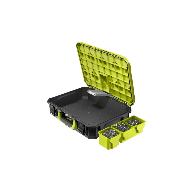 The RYOBI Link Tool Box - capacity 22.7 kg - RSL101 is a compact storage solution for organising tools as well as accessories. The interior of the box is intelligently compartmentalised to help you keep everything well organised. Specific storage is notably present to isolate bits and sockets. With an IP65 rating, you can be assured that the contents of the box are protected from water and dust ingress. The tool box is compatible with other products in the RYOBI Link system.