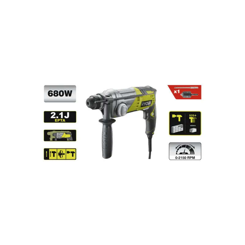 This RYOBI SDSPlus Hammer Drill - RSDS680-KA2 is ideal for your drilling tasks. It has a power of 680 W coupled with a striking rate of 5000 blows per minute. Additionally, this tool features 4 drilling modes for work suited to every situation and guaranteed versatility. Its compact design provides perfect handling in all circumstances.